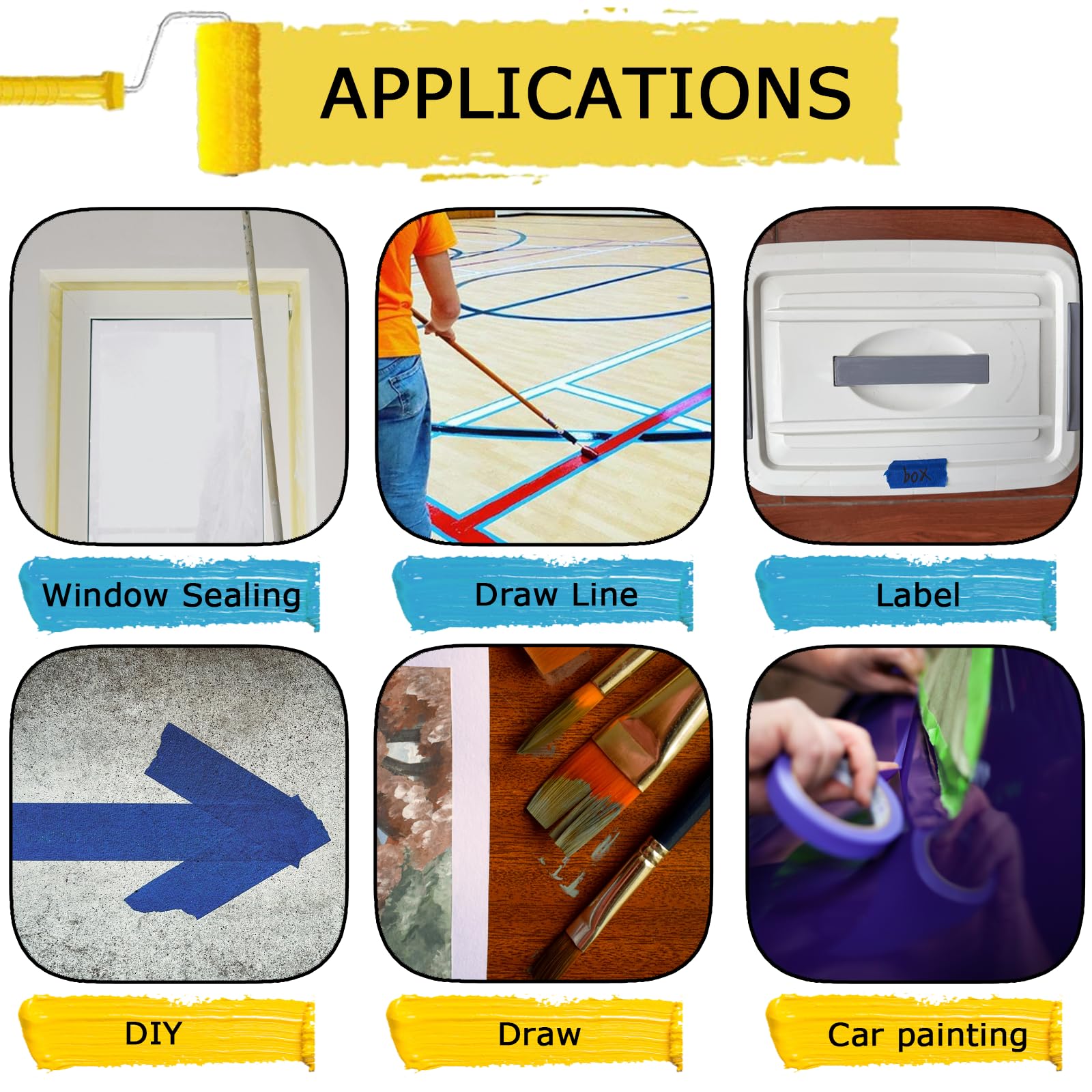 Painters tape 1 inch wide blue tape 1 inch This low tack freezer tape adopted high quality crepe paper and no residue glue. You can use 1 inch wide painters tape for art, painting, decorating, labeling, sealing, and light bundling. You may worry about the damage of coated surface cause by removing this blue paper packing tape when you use this fun tape for painting work. But we ensure you, by using this blue painters tape, you can get a great paint edge effect without any painted surface damage problems. This blue crepe paper masking tape roll painters tape for curves, model cars, wall painting, house painting, box sealing, watercolor painting, auto painting, decoration DIY, crafts, Art, frame a drawing paper, manicure, coating, labeling, bookbinding, wrapping, detailing, temporary paste, kitchen, etc.