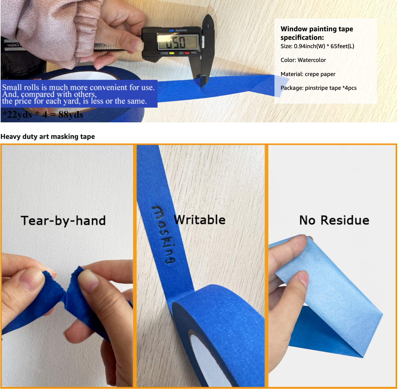 Blue painters tape 1 inch feature: Can be torn by hand decorators car masking tape, can be easily dispensed, easier to use this artist tape in sealing work; Writable surface, you can use printed masking tape as labels/mark; No residue, tape for walls no damage to paint, won’t left glue adhesive residue; Flexible to use, this blue crepe paper masking tape can be firmly stick to any surface, even small corner; UV resistance & heat resistance, suitable for indoor and outdoor usage; Impermeable, can effectively keep paint out, commonly be used in paint wall work to creative extra-sharp, straight, clean paint lines; Multiple use, can be stick into metal, glass, wooden, curved surface and etc;
