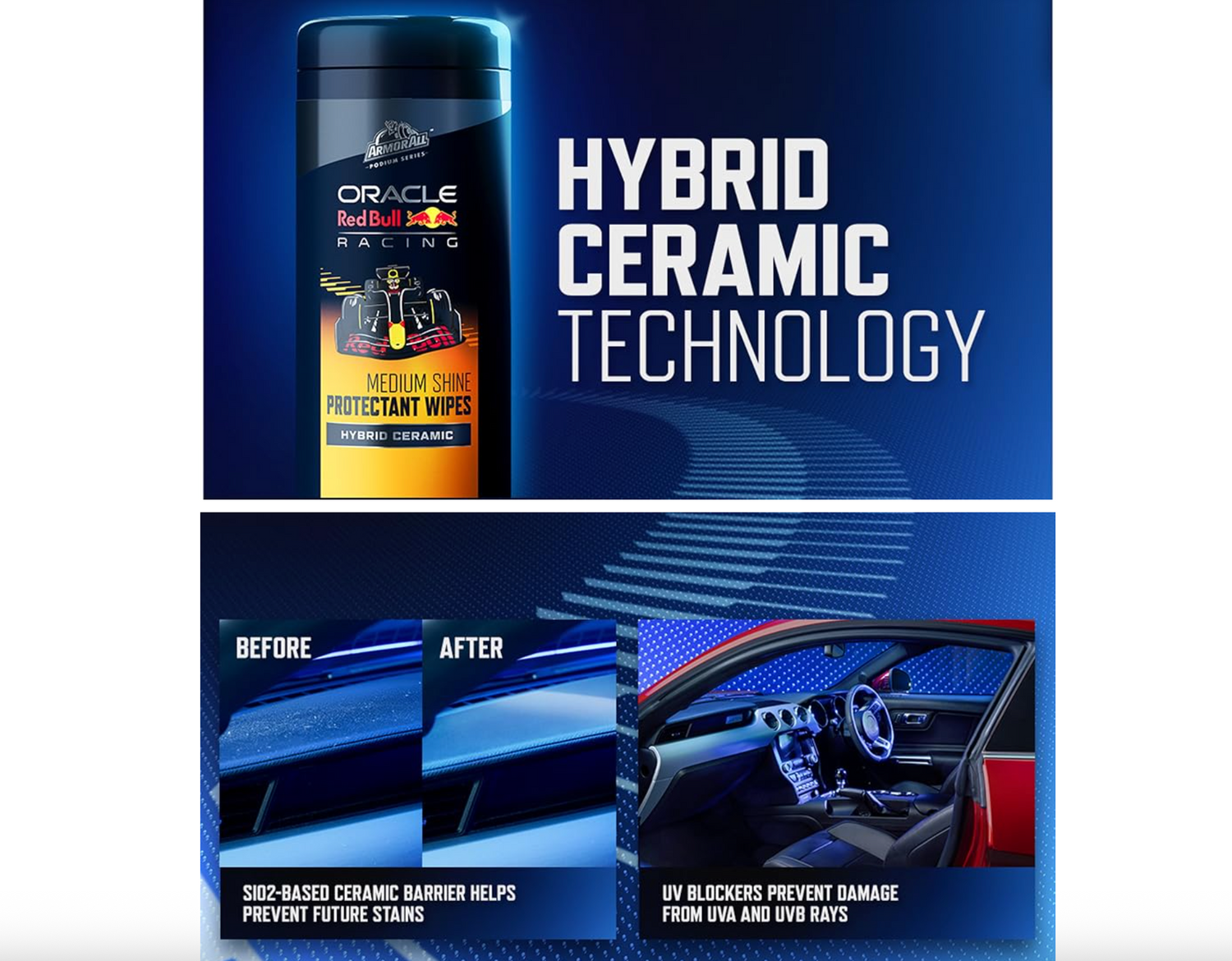 • DEVELOPED WITH ORACLE RED BULL RACING: One 25-count canister of Armor All Podium Series Hybrid Ceramic Medium Shine Protectant Wipes, hybrid ceramic interior car wipes developed to meet the elite performance standards of the Oracle Red Bull Racing team