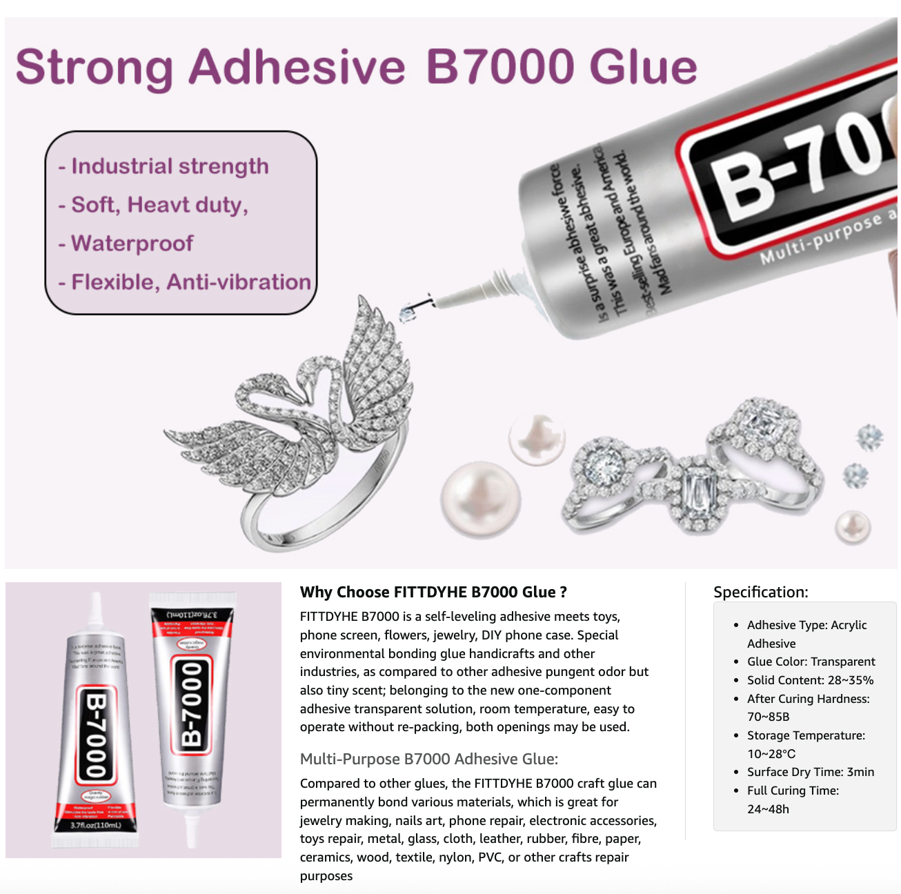 • 💪B7000 Professional Jewelry Glue for Crafts💪B-7000 jewlery glue has high-strength viscosity. Compared with other glue, B7000 rhinestone clear glue is a new type of transparent jewelry special glue, which is stick more firmly. The surface drying time is 5-10 minutes, the complete curing time is 24 hours, the optimal curing time is 48 hours, and the hardness after curing is 65-80a.