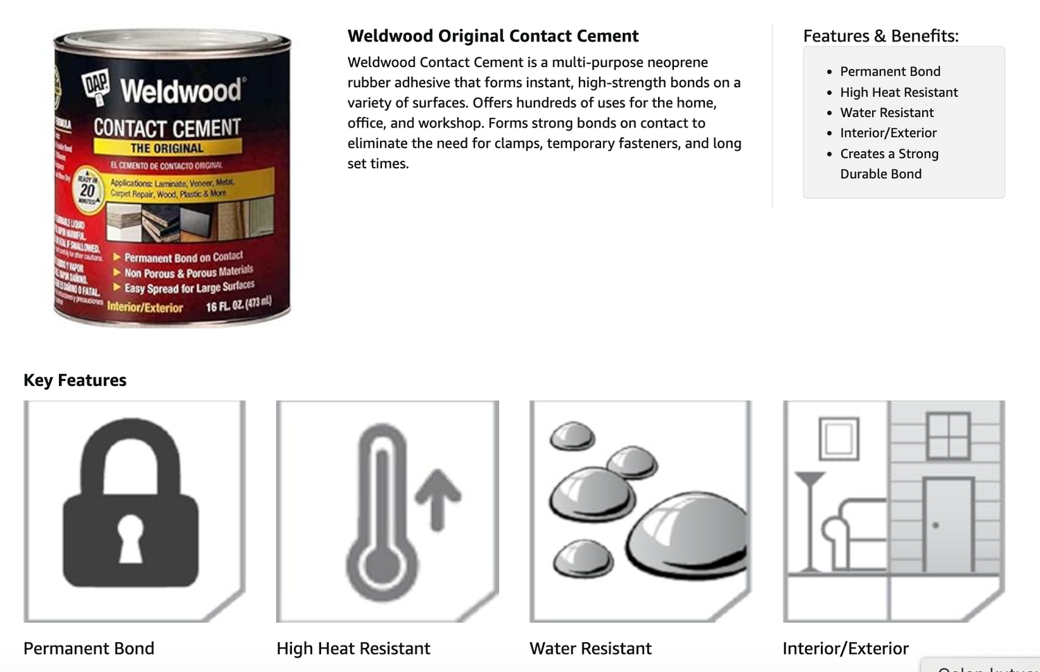 Achieve a strong, permanent bond on your projects with DAP Weldwood Original Contact Cement. This convenient 1-pint can provides a professional-grade adhesive that creates a bond on contact, making it the perfect tool for a wide range of repairs and installations.1 Its waterproof and flexible formula is designed for use on laminates, wood, rubber, leather, and more, providing a durable, long-lasting solution.