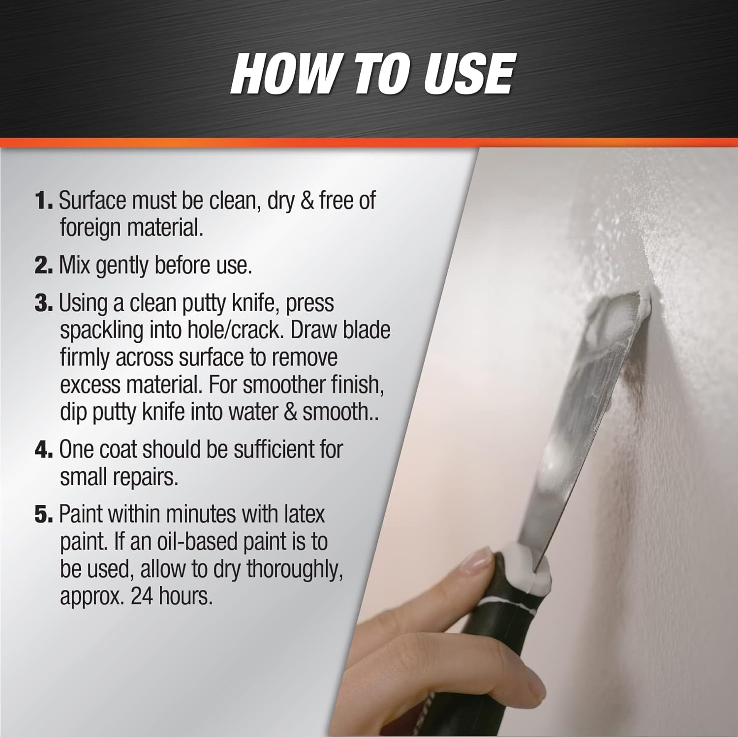 • Fast-Drying Formula: Designed for speed, this spackle dries quickly, allowing you to complete your repairs and paint over them in a short amount of time.