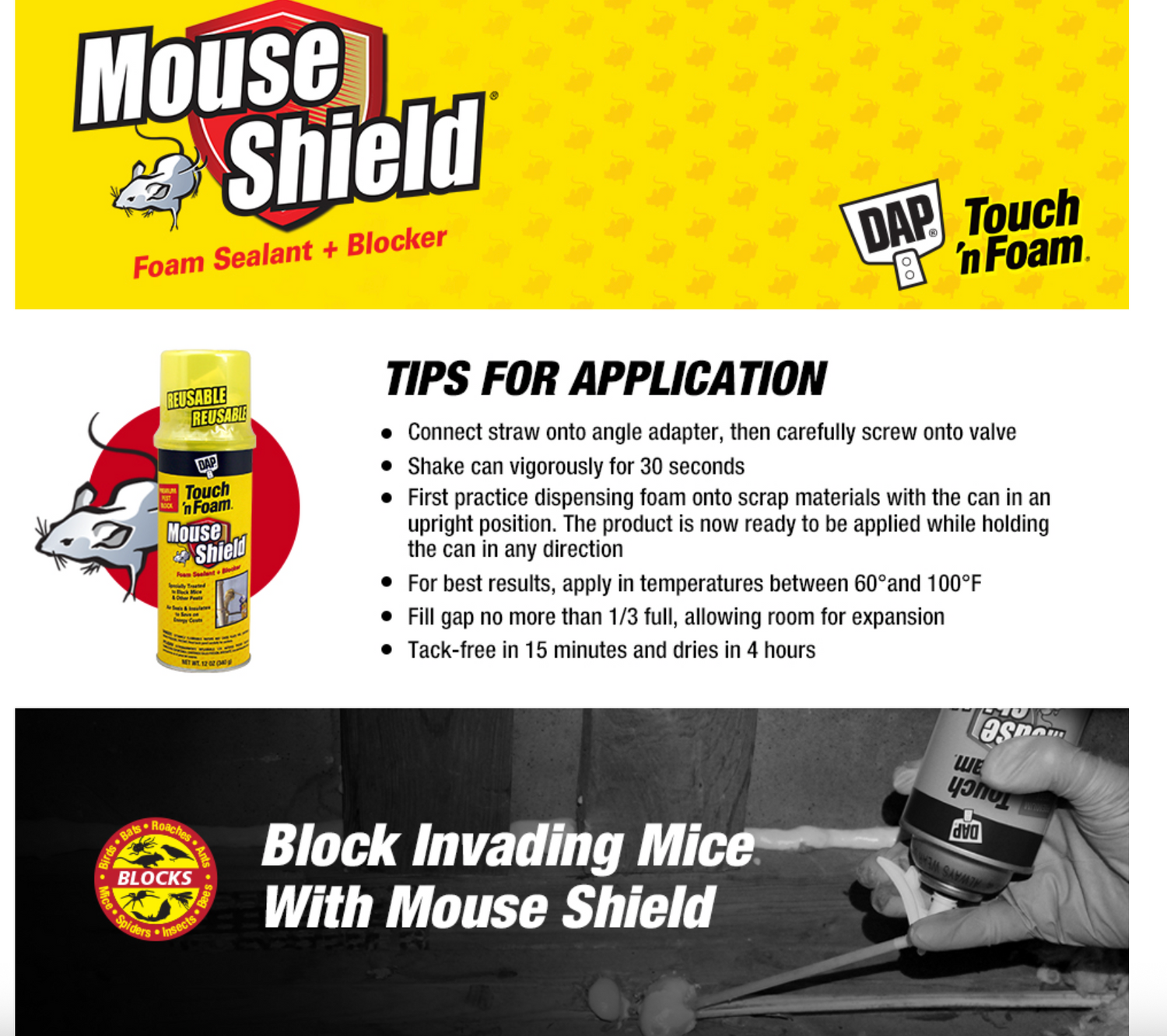 Details: DAP Touch 'n Foam Mouse Shield is specially treated to block mice, birds, bats, tree squirrels and other pests such as ants, roaches, spiders and bees. Use Mouse Shield to fill gaps and cracks inside your garage, attic, crawl space, basement, under sinks, around pipe/electrical penetrations or any areas where pests, insects or drafts can enter your home and living spaces.