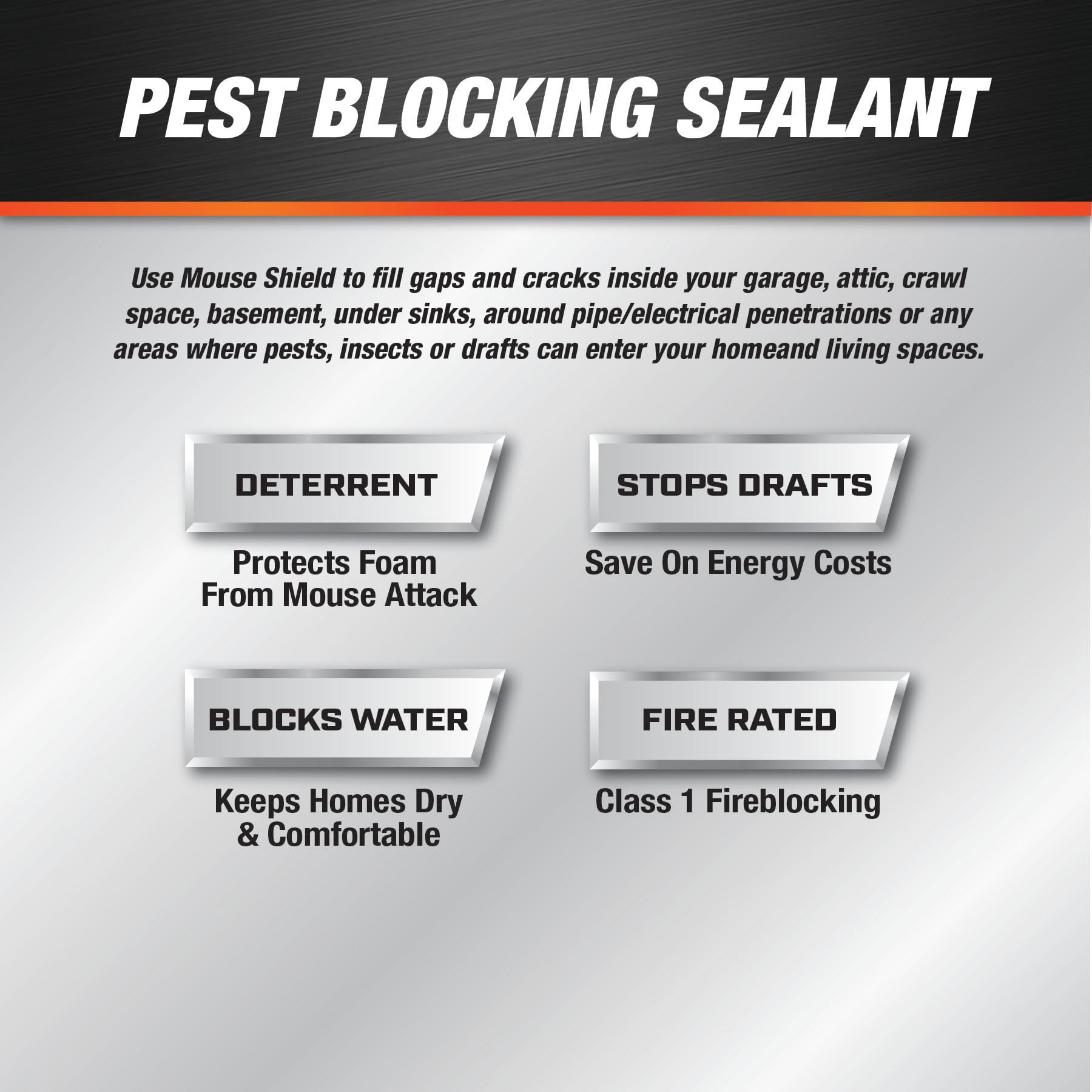 • Effective Pest-Blocking Formula: Our Mouse Shield foam sealant is specifically formulated to deter mice and other rodents.2 It creates a durable, airtight barrier that pests are unable to chew through, keeping your home protected.