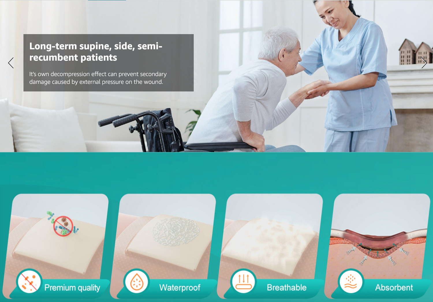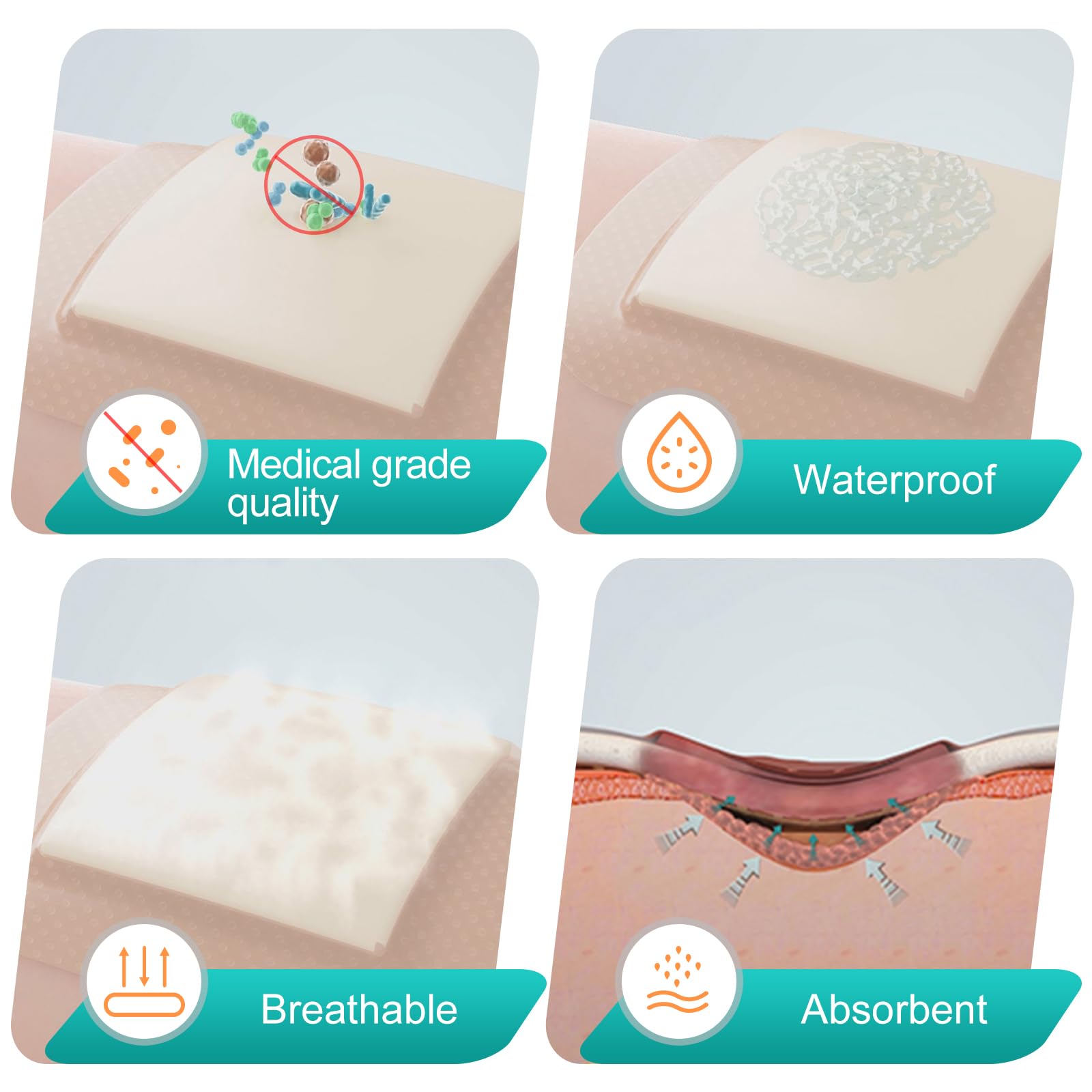 Directions PROMOTE HEALING LESS PAIN - Absorb wound exudate using the 5-layer material, maintain a healthy moisture environment, create a barrier from the outside, promote wound healing. Change the dressing when it is saturated, soiled, or according to the local protocol (up to seven days). GENTLE BUT SECURE ADHESION - Use the A+ medical-grade hypoallergenic soft silicone as a wound contact layer, absorb dead tissue cells, avoid sticking to the moist wound, stick to dry skin, minimize pain and trauma at dressings change. WATER-RESISTANT PROTECTION - Use the semi-permeable PU film layer, which is water-resistant and breathable, to provide a liquid barrier while allowing the passage of oxygen and water vapor, effectively protect the wound healing process. MAKE LIFE EASIER - Use the foam pads with a unique 2mm thick foam core layer to maximize absorbency, SAF layer to lock exudates and avoid maceration, nonwoven layer to disperse exudate, more absorbent than traditional bandage gauze, no need to change frequently.