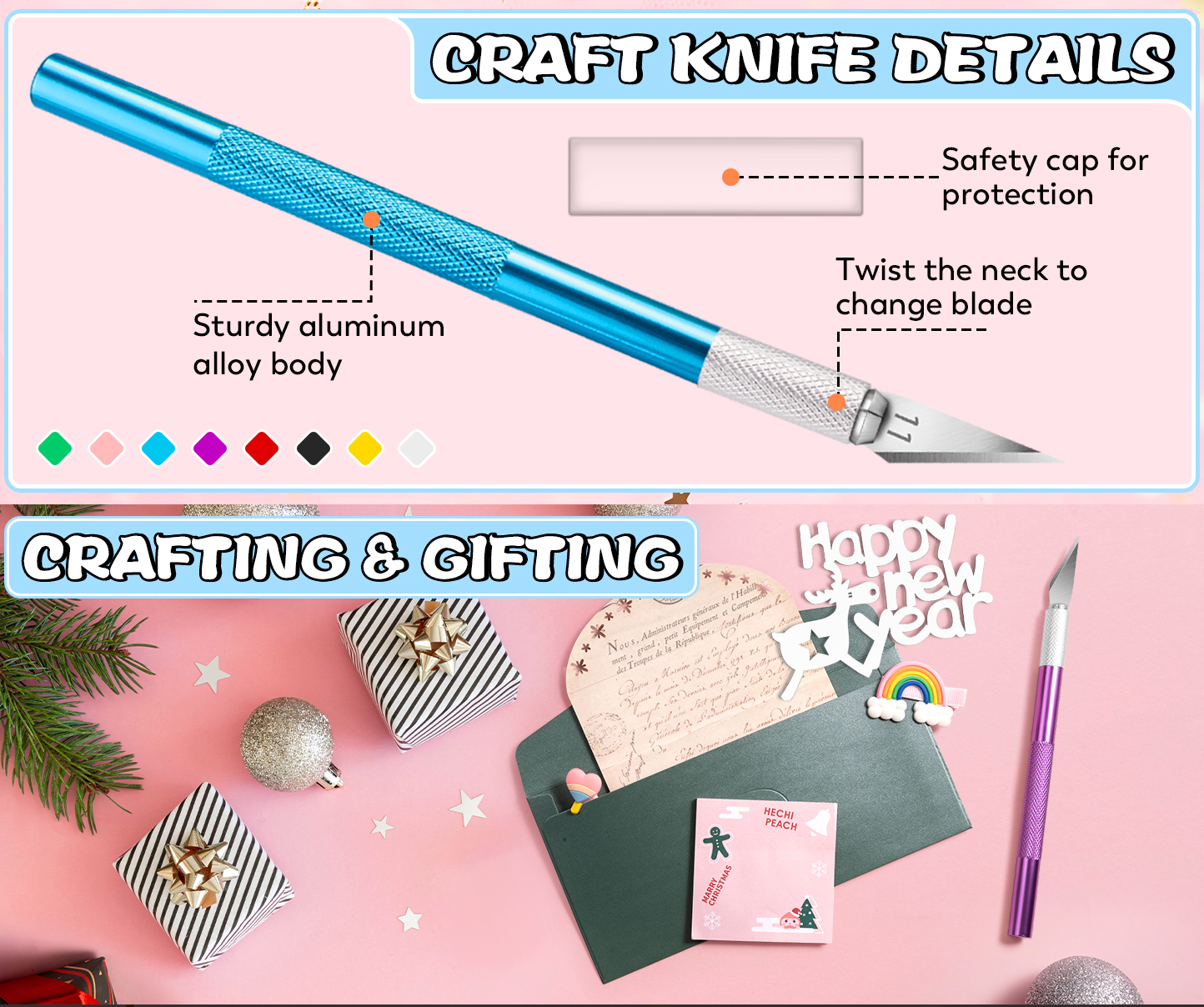 • Craft Knife Set Includes: 4 craft knives (pink, green, blue, black) and 40 replaceable #11 blades. Excellent crafting tools for art, scrapbook or craft supplies meet your needs