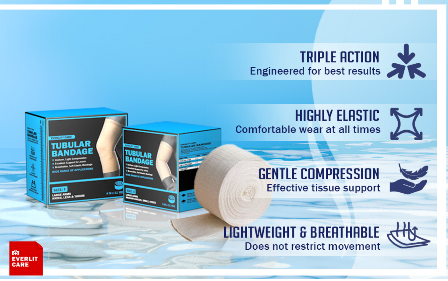 The Everlit Care Elastic Tubular Bandage The Everlit Care Elastic Tubular Bandage is designed to provide continuous support for the management of strains, sprains and swelling. Upon application, covered elastic threads within the cotton fabric moves to adjust to the body contours and distribute pressure evenly over the skin surface. The bandage can be used for tissue support, bandage fixation and pressure dressing. It offers the patient freedom of movement as it adjusts to the body contours and distributes the pressure evenly. One of the best things about the bandage is that it can be cut to accommodate the exact amount of bandage needed, and does not require any tapes or pins to stay in place.