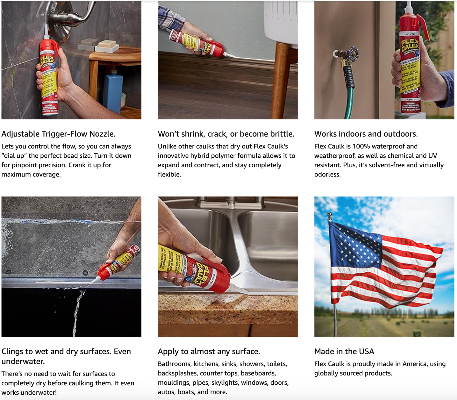 • Waterproof & Weatherproof: Designed to withstand the elements, Flex Caulk is perfect for both indoor and outdoor applications. It creates a waterproof seal that protects against moisture, rain, and extreme weather conditions.