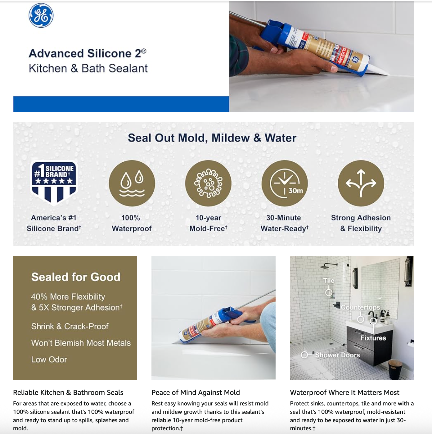 Product Description GE Advanced Silicone 2 Kitchen and Bath sealant is a high-performance, 100% silicone and 100% waterproof sealant ideal for areas prone to water exposure. GE Advanced Silicone 2 Kitchen and Bath sealant is permanently flexible with 40% more flexibility than Class 25 sealants and has 5X stronger adhesion than our Silicone 1 sealant. It will not discolor most high-end metal finishes such as chrome, bronze, and nickel. This sealant also has a low odor while curing thanks to its neutral-cure formula. Use our silicone kitchen and bathroom sealant on a variety of common surfaces, including most metals, plastics, and woods; glass, drywall, plaster, granite, and more.