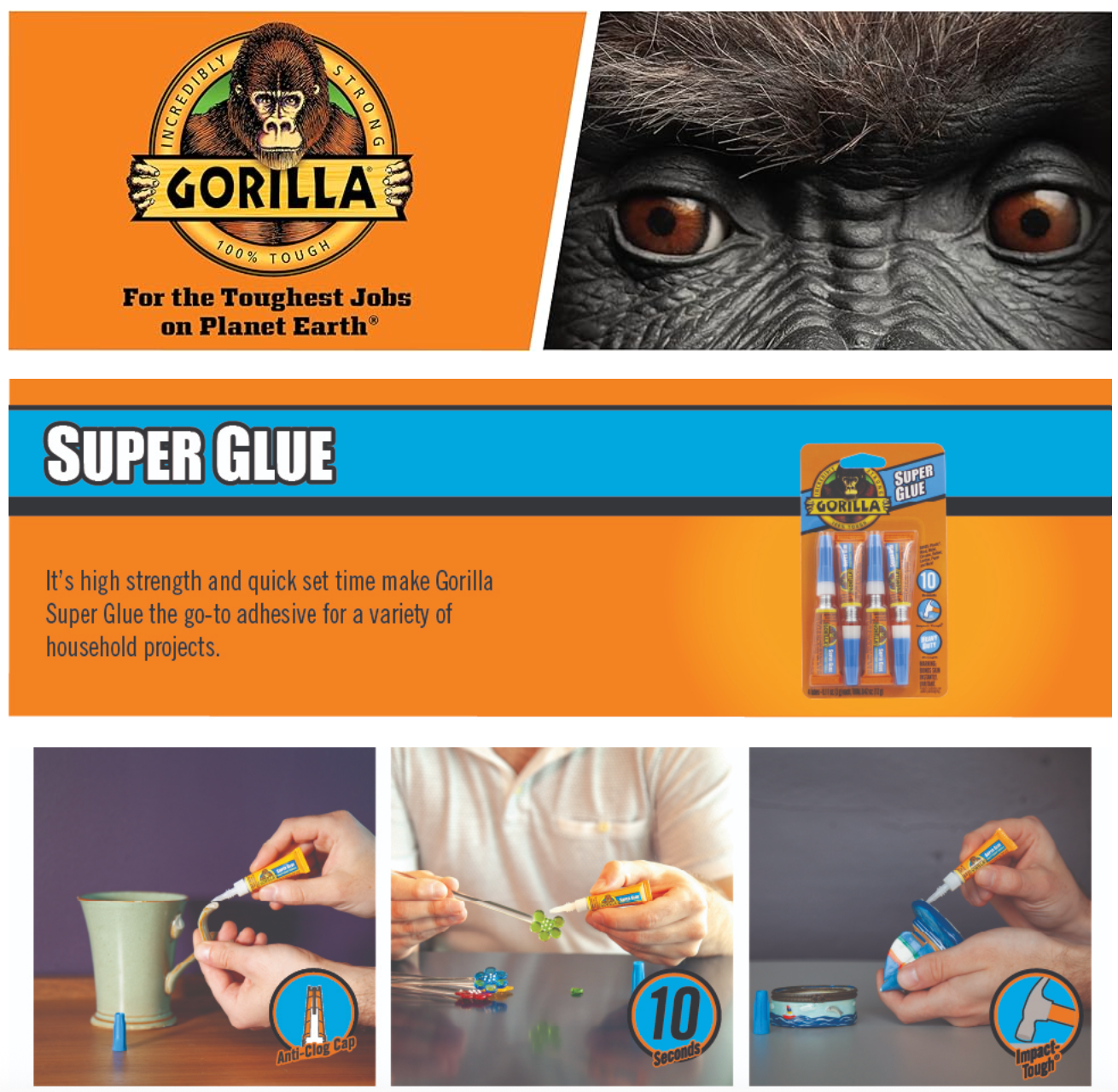Details: Its high strength and quick set time make Gorilla Super Glue the go-to adhesive for a variety of household projects. Developed for long-lasting repairs in an instant, the clear glue dries in 10-45 seconds. Our Super Glue is reinforced for increased impact resistance to handle bumps and drops. We call it Impact-Tough® because the reliable bond stands up to wear and tear. Super glue, also referred to as cyanoacrylate glue, or CA glue, works on a variety of materials, including plastic*, metal, stone, ceramic, paper, rubber and more. In addition to Gorilla Super Glue's high-performance cyanoacrylate formula, we've added an anti-clog cap with a metal pin inside ensuring an airtight seal for maximum reusability. It's Gorilla tough, every time.