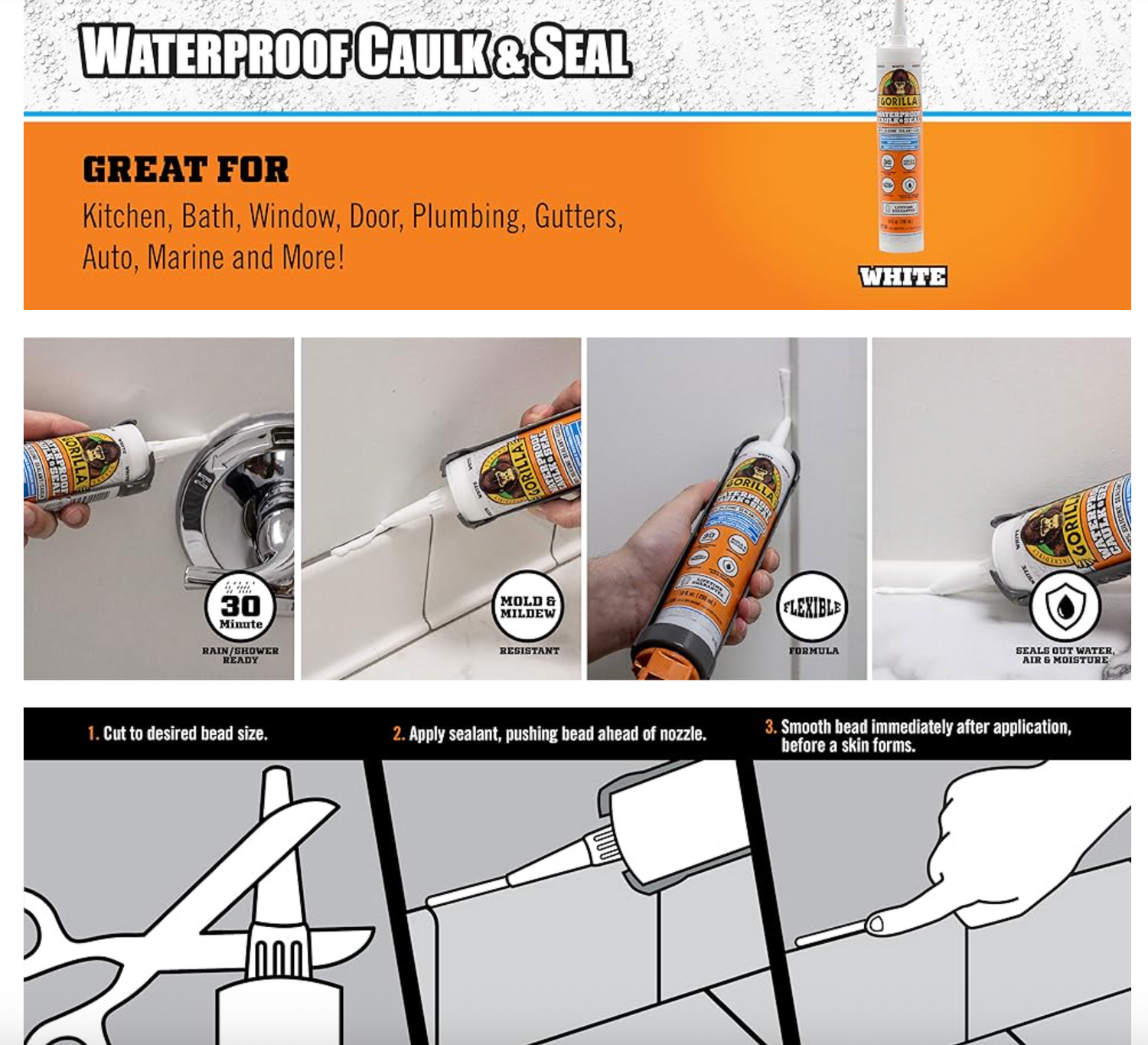 Details: Gorilla Waterproof Caulk & Seal 100% Silicone Sealant* seals out water, air and moisture and is great for kitchen, bath, window, doors, auto, marine plumbing, gutters and more! Ready for water exposure in just 30 minutes, this waterproof sealant is mold & mildew resistant. This silicone sealant won't yellow, shrink or crack over time!