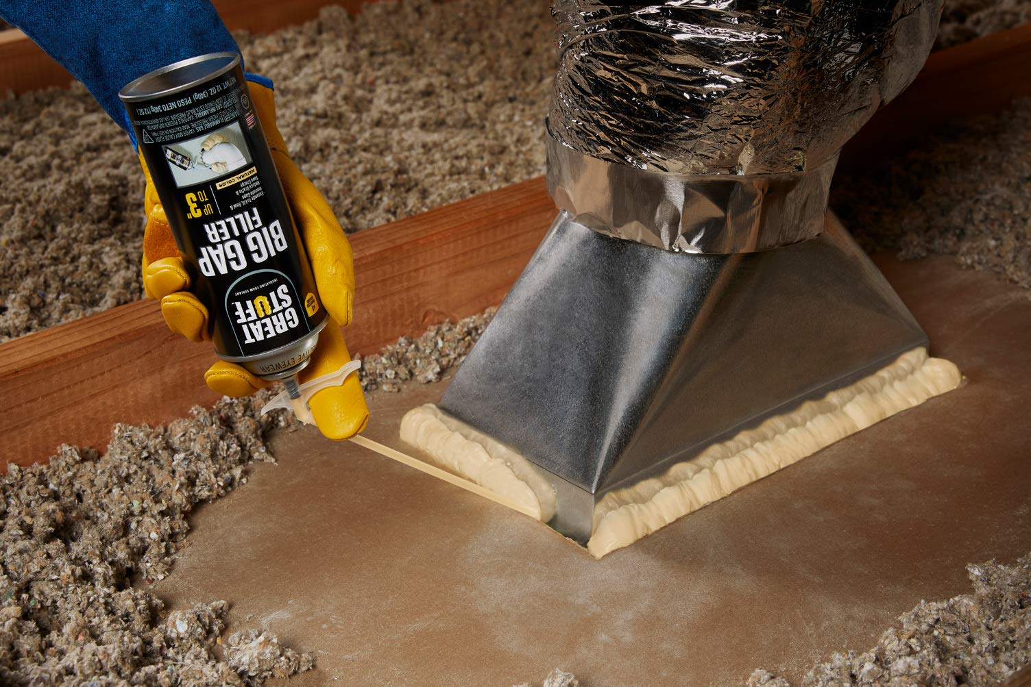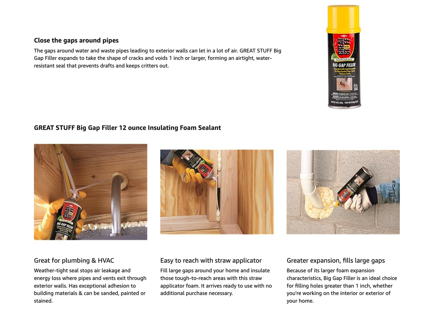 GREAT STUFF Big Gap Filler Insulating Foam Sealant offers the same benefits as GREAT STUFF Gaps & Cracks but fills gaps larger than 1 inch. So it's great for creating larger weather-tight seals to stop drafts and keep critters out. Plus, like all GREAT STUFF products, it's airtight, paintable, stainable and sand-able. It's polyurethane-based and perfect for all sorts of materials like wood, drywall, metal, masonry, glass and most plastics.
