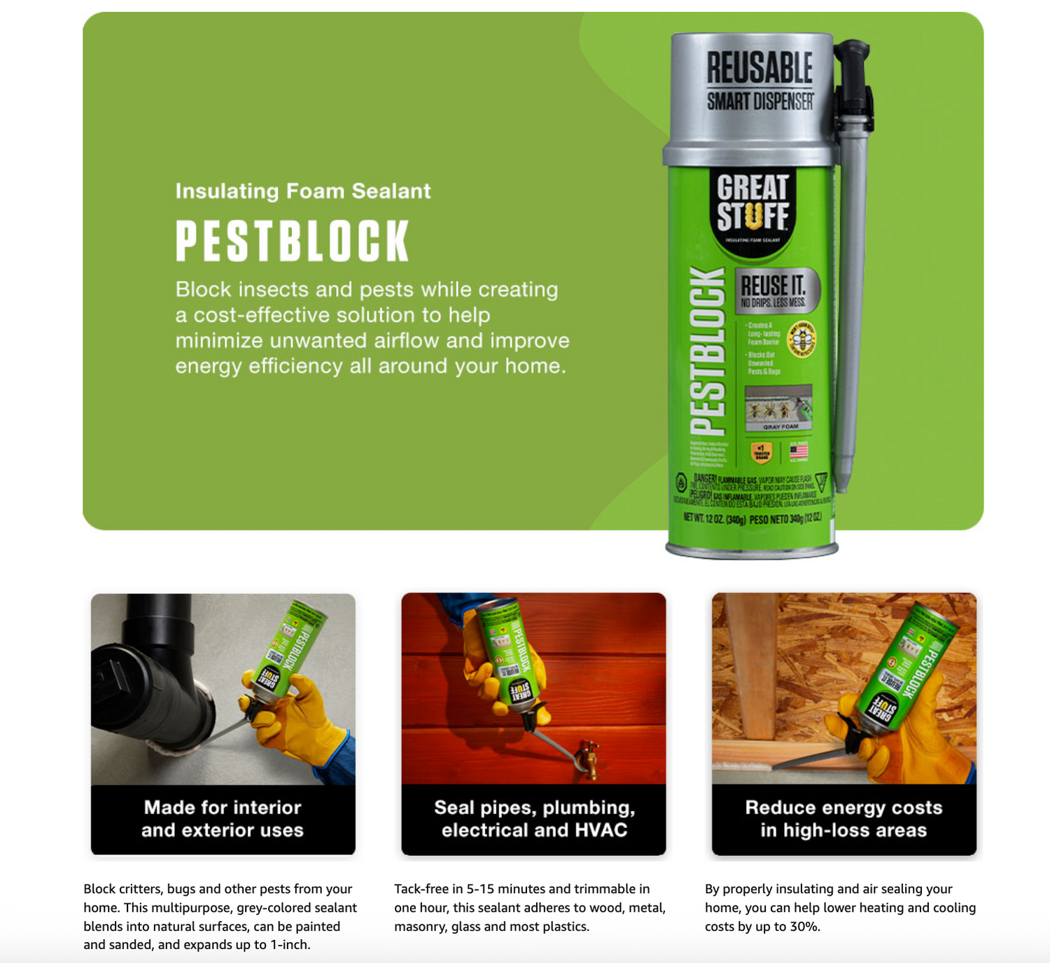 • Pest-Blocking Formula: This pestblock foam sealant expands to fill gaps and cracks, creating a durable barrier that pests can't get through. It's an effective solution for blocking drafts, insects, and rodents.