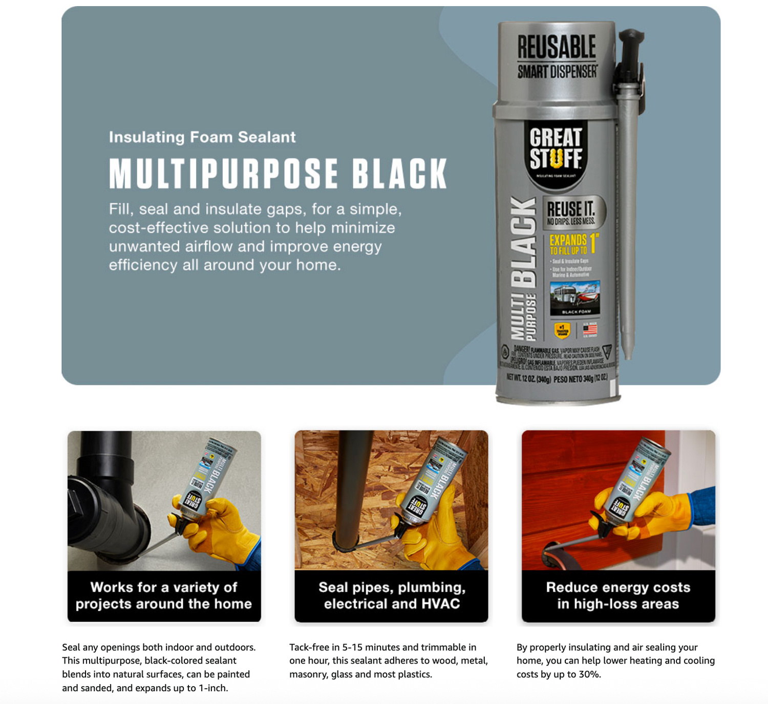 • Fills, Seals & Insulates: This multipurpose black foam sealant expands to fill gaps and cracks up to 1 inch, creating a permanent barrier against drafts, moisture, insects, and pests.