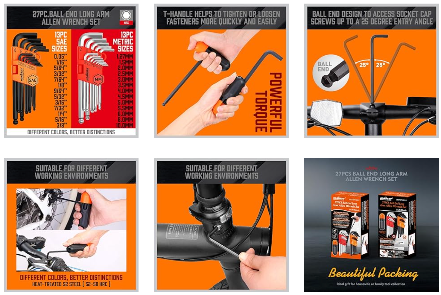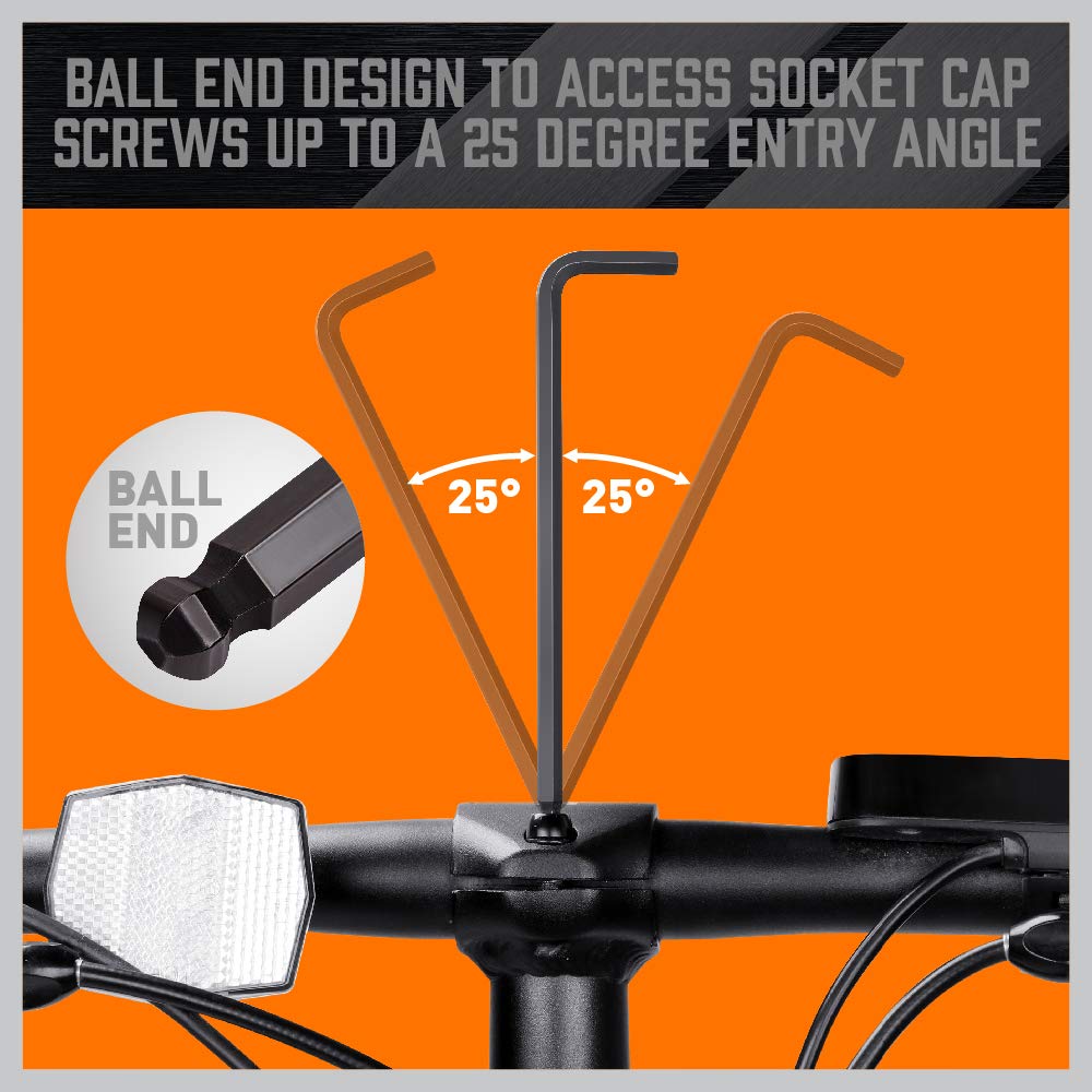 • Long Arm & Ball End Design: The long arm allen wrench provides extra reach and torque for those hard-to-access bolts, while the ball end allows for an angled entry up to 25 degrees, making it a versatile and convenient tool.