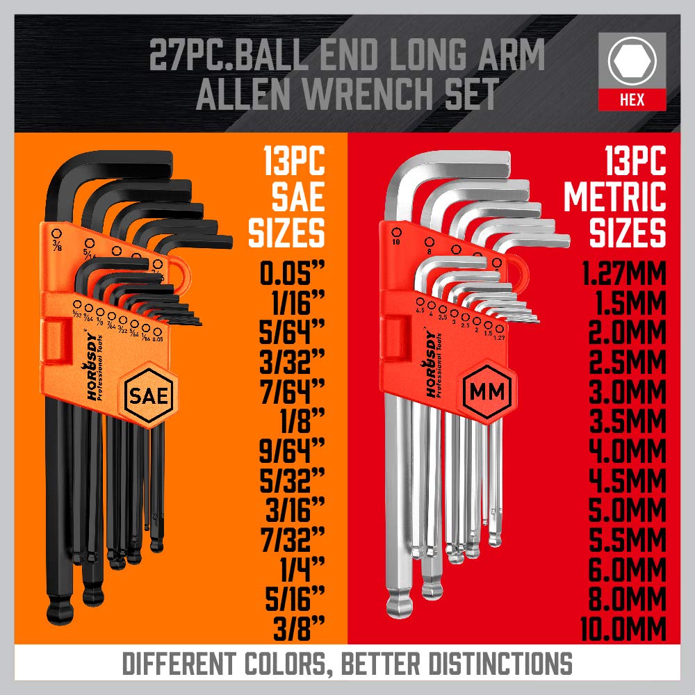 27PCS Durable Hex Key Allen Wrench Long Arm Set with Ball End, Metric and Standard Sizes Allen Key Set with Another T Handle, Heat-treated CR-V Steel