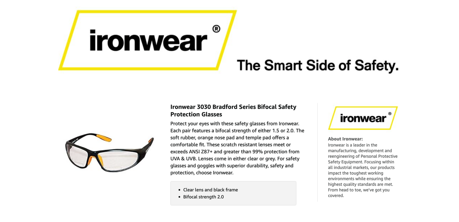 What's in the box: Ironwear Bradford 3030 Series Nylon Protective Safety Glasses with 2.0 Bifocal Lens, Clear Lens, Black Frame (3030-C-2.0)