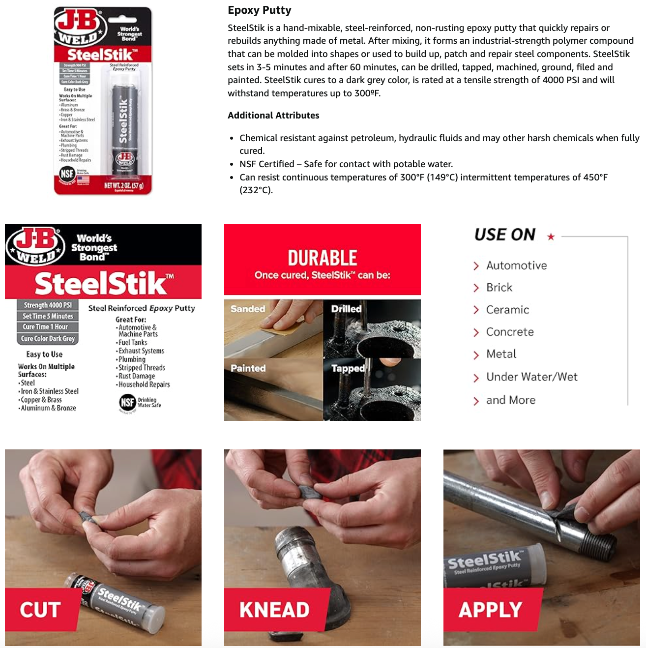 • J-B Weld Steelstik: A Hand Mixable Two Part Epoxy Putty Stick That Is Steel Reinforced & Non-Rusting To Quickly Repair Or Rebuild Anything Made Of Metal! J-B Weld Steelstik Is Certified By The Nsf And Is Safe For Contact With Potable Water