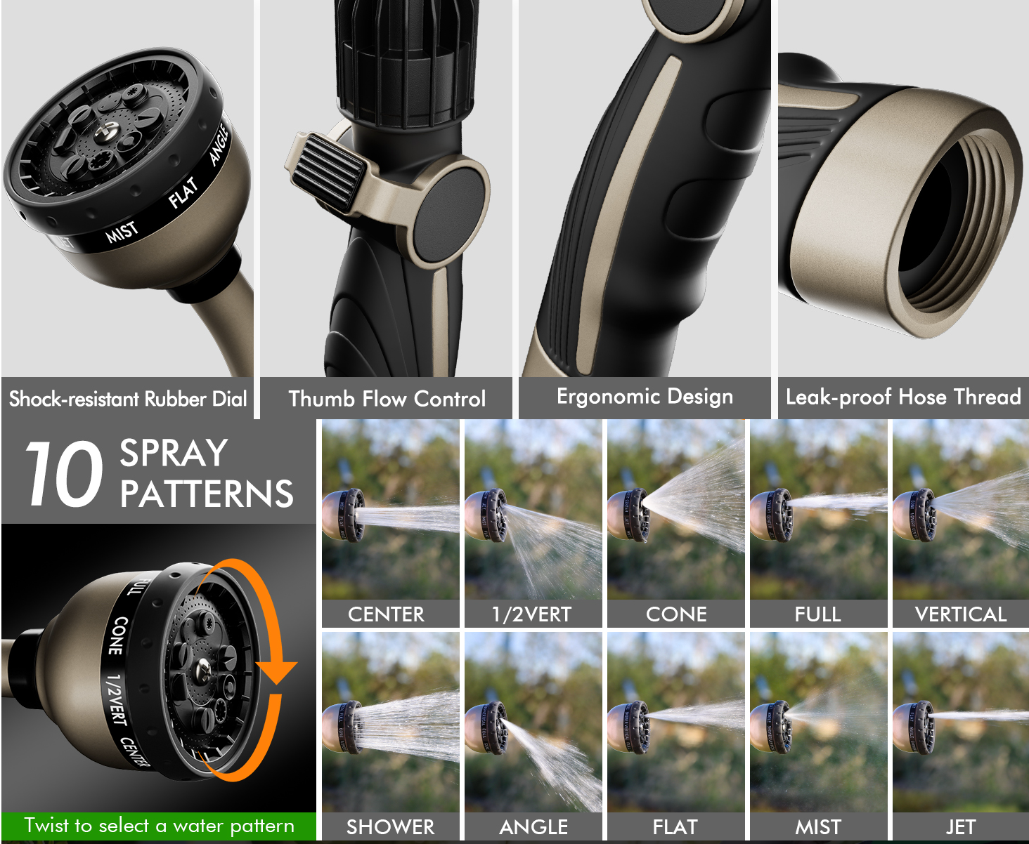 • 【10 Watering Patterns】Rotate the spray head dial to select a water pattern from Shower, Flat, Full, Mist, Jet, Center, Cone, Angle, Vertical, and ½ Vertical. Whether you need the high-pressure jet to clean your window, the useful angle to wash your car, the gentle shower to clean your shrubs, or the soft mist to water your hanging baskets, the 10 patterns have you all covered.