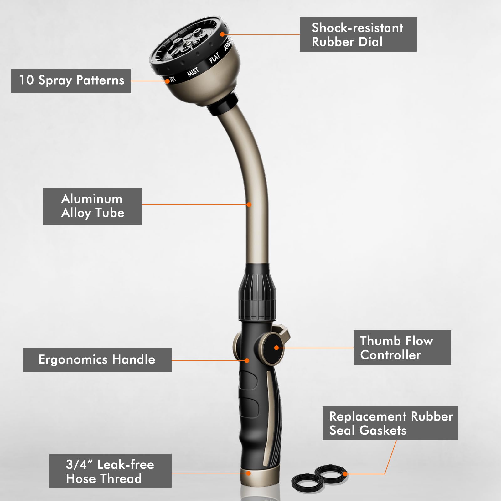 • 【Heavy Duty Metal Watering Wand】Constructed with premium zinc-alloy material, this 15-inch hose wand sprayer is solid & strong to resist daily drops and shocks. The bronze powder painting, TPU coating and rubberized bezel dial can enhance durability & flexibility and withstand hard impacts & heavy force. A long-lasting garden hose wand you can count on many years.