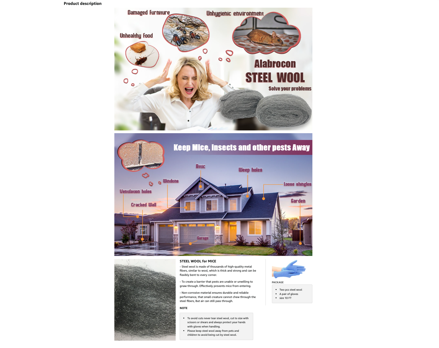 • 【Package and Note】: Two separate 10 foot long pieces of steel wool, a pair of gloves. Note: Please inspect the steel wool parts regularly and replace damaged steel wool. Please keep steel wool away from pets and children to avoid being cut by steel wool.