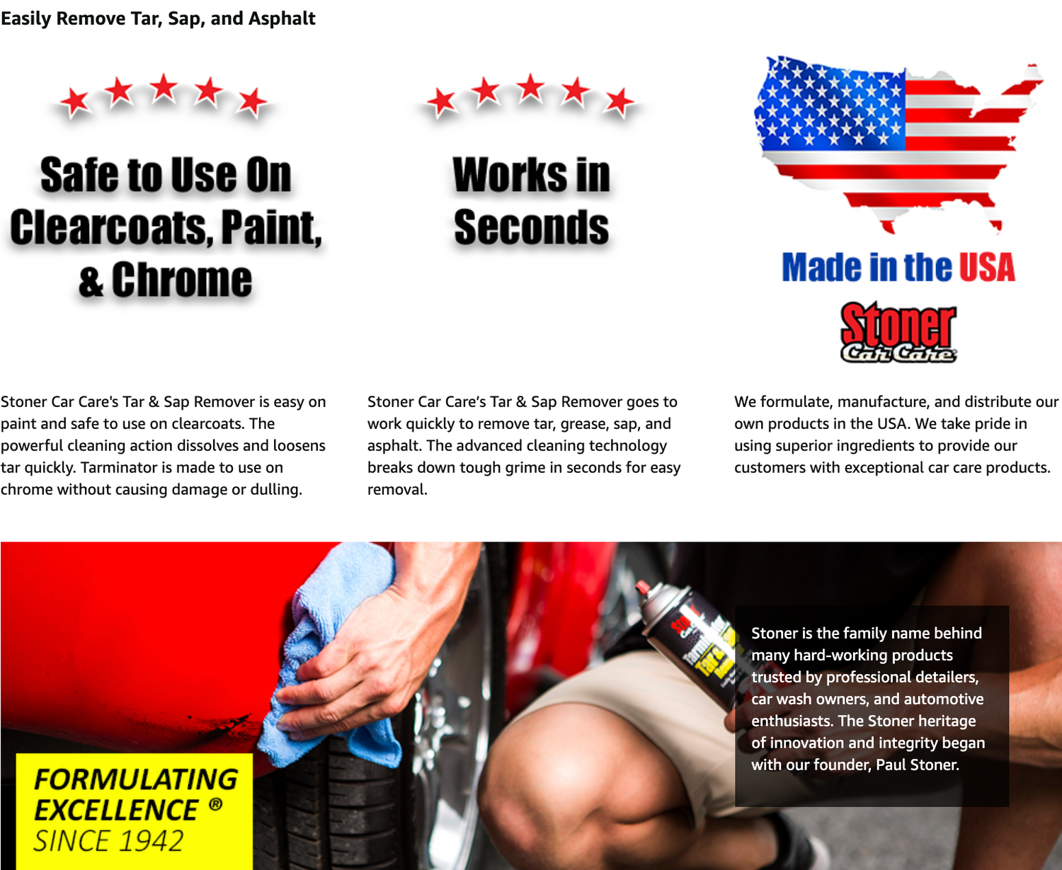 Details: If You’Re A Car Owner Who Has Invested Time, Money, And Resources Into Your Car, Those Tar Splatters Can Be Incredibly Frustrating. Fortunately, Stoner Car Care’S Tarminator Tar, Sap, And Asphalt Remover 91154 Is A Highly Effective Product That Safely Removes These Materials In A Matter Of Seconds. The Micro Active Cleaning Technology Infused Into Tarminator'S Formula Has An Unequaled Ability To Remove Even Baked-On Tar, Sap, And Asphalt. It Easily Removes Road Grime, Is Safe To Use On Paint And Clear Coats, And Can Even Be Used On Chrome. It Is Engineered To Remove Sticky Materials From Chrome Without Dulling Or Damaging The Is The Solution That Professional Auto Detailers, Dealers, And Passionate Automotive Enthusiasts Depend On To Remove Tough Grime Instantly. This Tar And Sap Remover Works Incredibly Fast By Penetrating Deep Into The Materials. It Breaks Down Sticky Materials In A Matter Of Seconds, Allowing You To Wipe Off The Residue And Completely Remove Debris From Chrome, Paint, And Clear Coats. Simply Rinse The Soiled Area With Water To Cool Down The Surface And Remove Light Dirt, As Tarminator Works Best On Cool Surfaces. Spray The Tarminator Onto The Soiled Area, Doing Small Areas At A Time For The Best Results. Within 30 To 60 Seconds, Quickly Wipe Off And Rinse With Clean Water To Remove Excess Material. It’S Really That Simple. For More Than 75 Years, Stoner Car Care Has Sold Superior Automotive Care Products To Professional Detailers, Restoration Specialists, And Car Dealerships. Now, We Offer The Best Tar, Sap, And Asphalt Remover On The Market To The Passionate Automotive Enthusiast. We Formulate, Manufacture, And Distribute Our Own Products In The United States, Unlike Some Of Our Major Competitors.