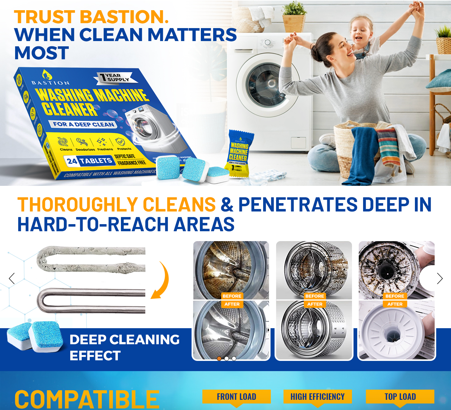 • Universal Compatibility: Our tablets are safe and effective for all types of washing machines, from front loader to top load, and are compatible with all HE (High-Efficiency) models.