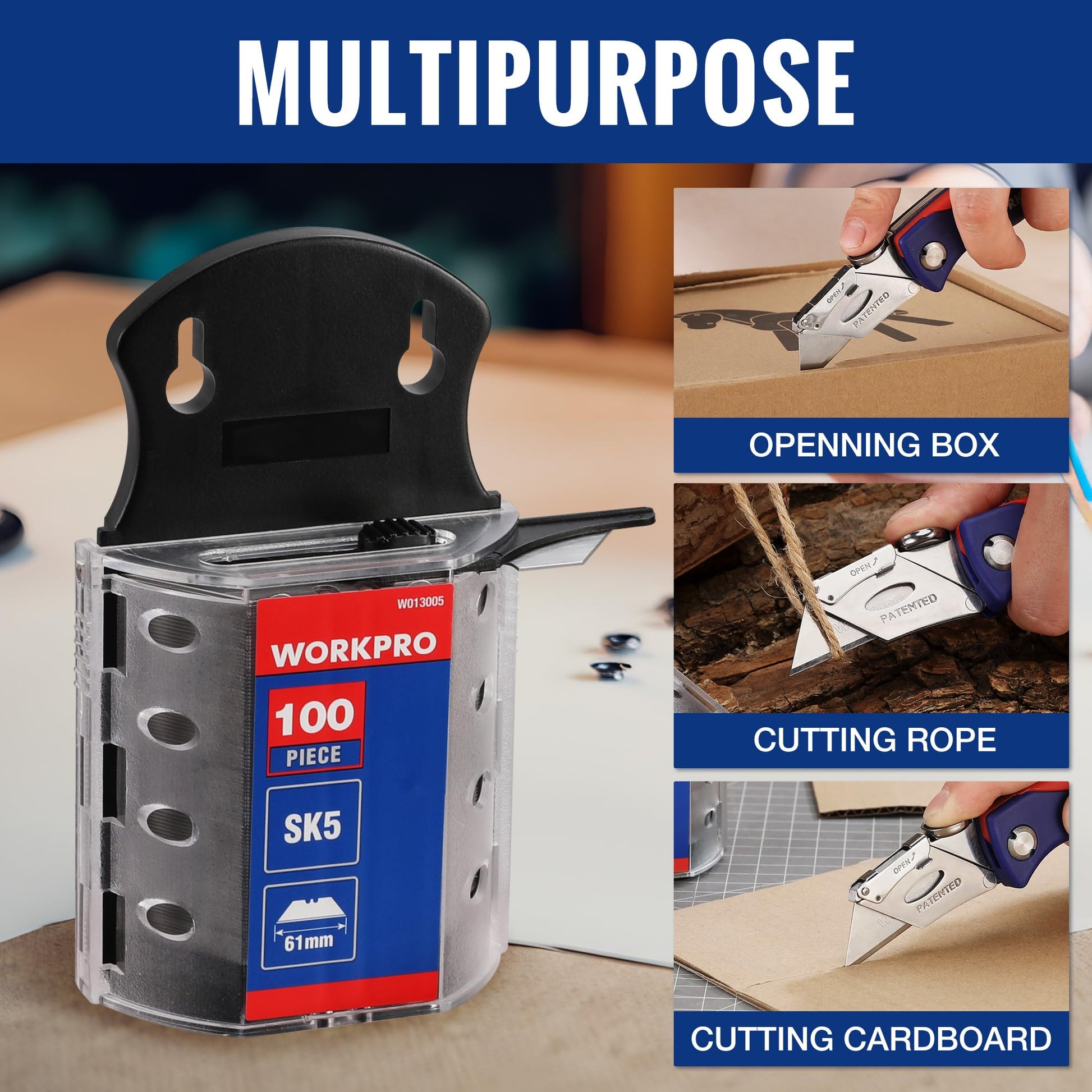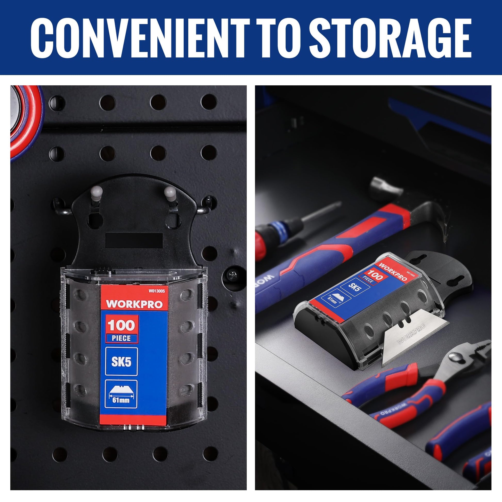 WORKPRO Utility Knife Blades, SK5 Steel, 100-Pack with Dispenser